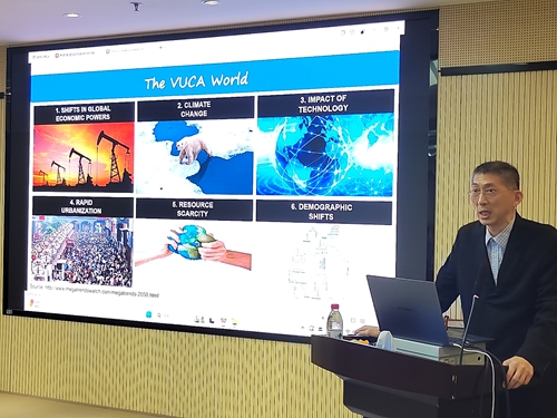杨杰圣教授以“什么是VUCA时代”切入主题,深入阐释了“易变性(Volatile)、不确定性(Uncertain)、复杂性(Complex)、模糊性(Ambiguous)”的时代特征,指出全球正处于前所未有的变革浪潮中,并系统分析了该时代背景对研究、教育及就业领域的深刻影响。